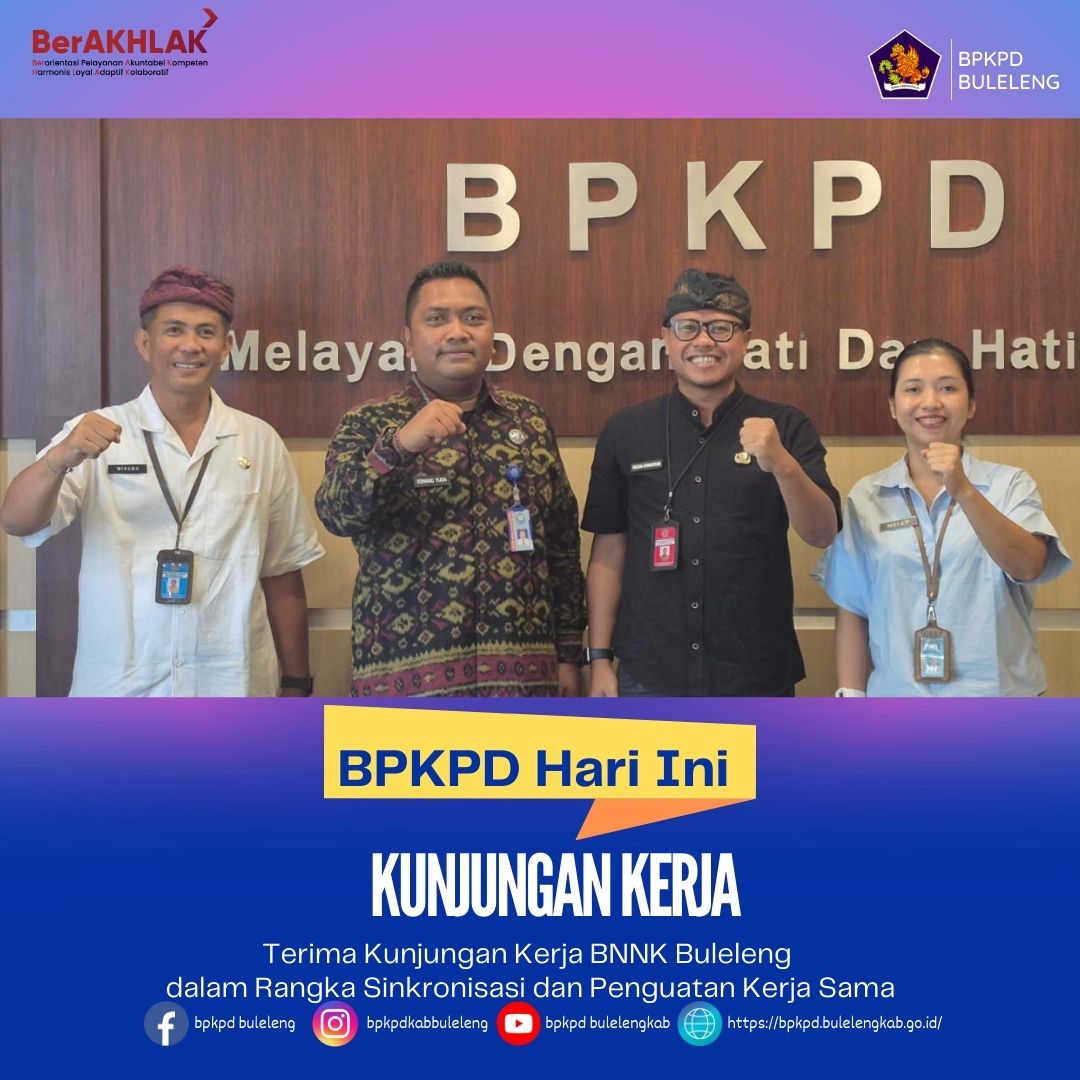 Kepala BPKPD Kabupaten Buleleng menyampaikan apresiasi atas kunjungan kerja BNNK Buleleng dan menegaskan komitmen BPKPD untuk terus memperkuat kolaborasi dengan instansi vertikal. Sinergi yang terbangun diharapkan mampu mendukung terciptanya tata kelola pemerintahan yang efektif dan akuntabel di Kabupaten Buleleng.