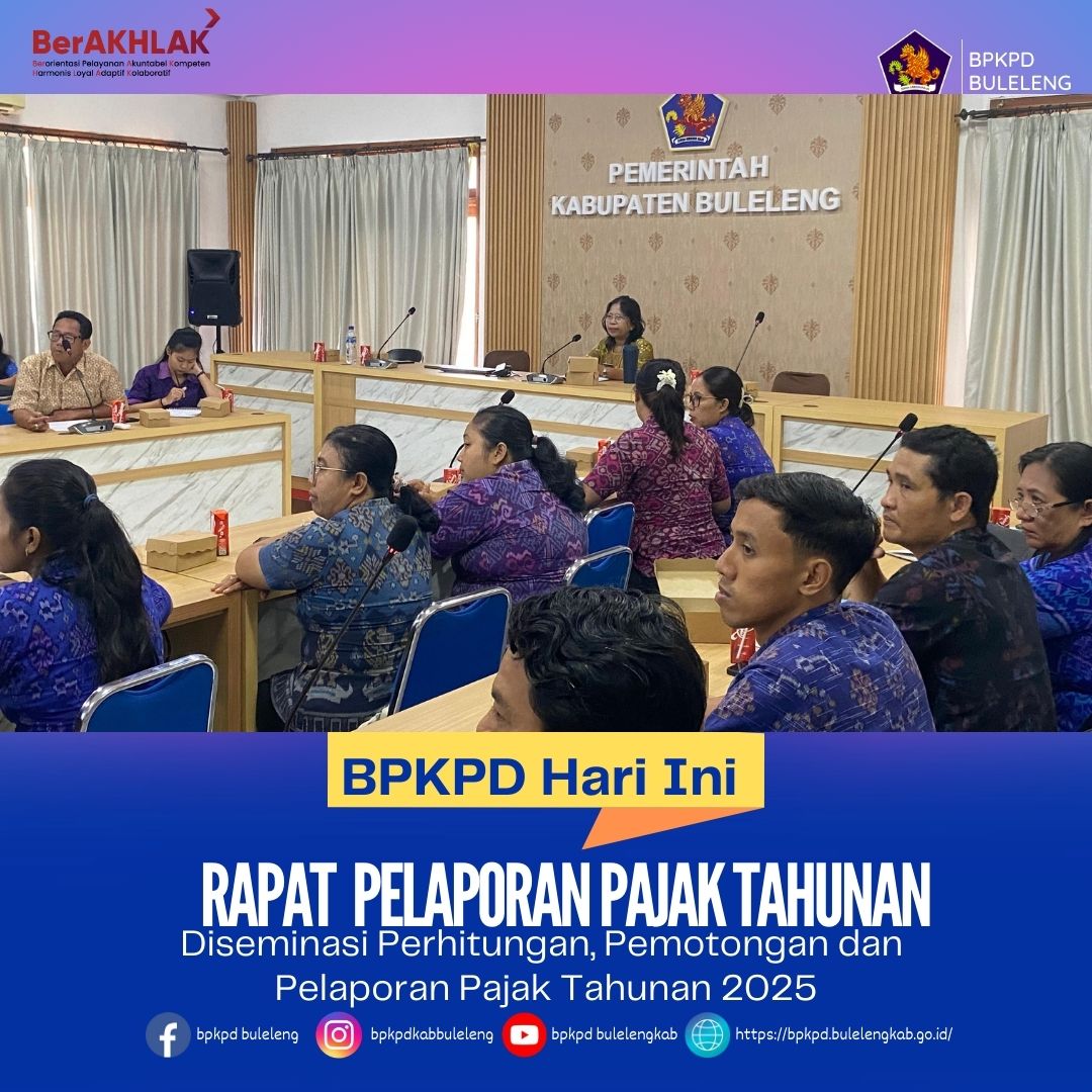 BPKPD Kabupaten Buleleng menyelenggarakan Diseminasi Perhitungan, Pemotongan, dan Pelaporan Pajak Tahunan 2025 bertempat di Ruang Rapat BPKPD. Kegiatan ini dibuka secara resmi oleh Kepala Bidang Perbendaharaan selaku koordinator pelaksanaan teknis perbendaharaan daerah.