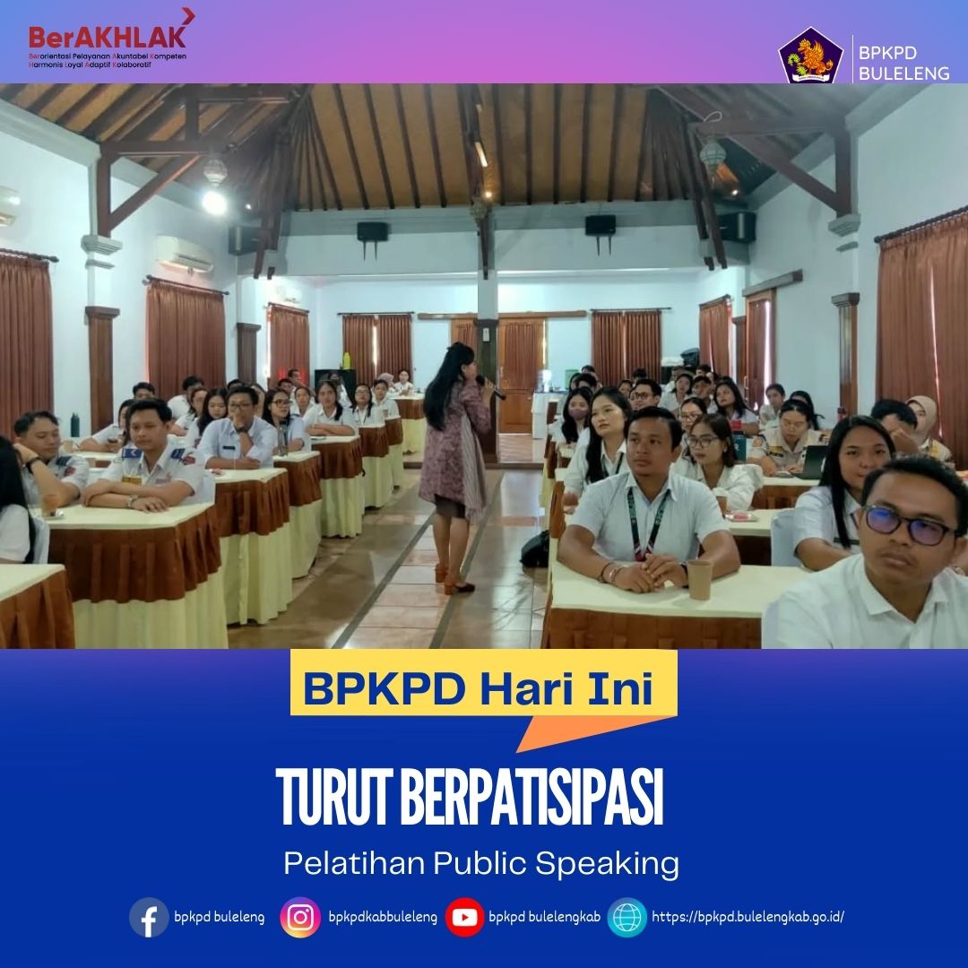 Badan Pengelola Keuangan dan Pendapatan Daerah (BPKPD) Kabupaten Buleleng turut hadir dan berpartisipasi dalam kegiatan Pelatihan Public Speaking yang diselenggarakan oleh Dinas Pendidikan, Kepemudaan, dan Olahraga (Disdikpora) Buleleng pada Rabu (3/12/2025). Kegiatan berlangsung di Rangon Sunset, menghadirkan suasana pelatihan yang interaktif dan inspiratif.