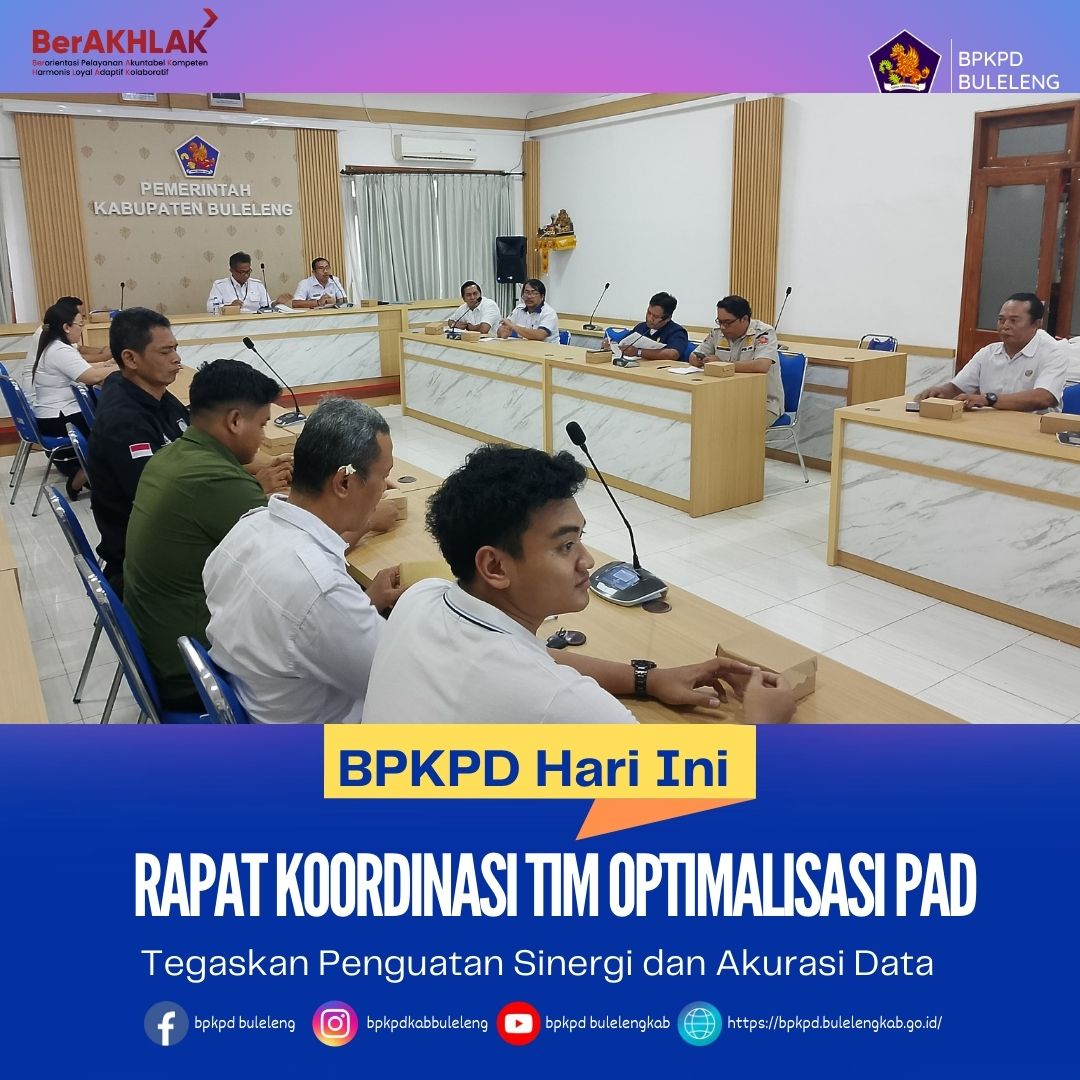 Rapat Koordinasi pelaksanaan Tim Optimalisasi Pendapatan Asli Daerah (PAD) Kabupaten Buleleng diselenggarakan hari ini (10/12) di Ruang Rapat BPKPD Kabupaten Buleleng. Pertemuan dipimpin langsung oleh Sekretaris BPKPD selaku Wakil Ketua Tim Optimalisasi PAD dan didampingi oleh Kepala Bidang Penagihan dan Evaluasi. Rapat dihadiri anggota tim eksternal dari berbagai instansi, antara lain Kejaksaan Negeri Buleleng, Polres Buleleng, Kantor Pertanahan (Kantah) Buleleng, KPP Pratama Singaraja, Satuan Pol PP Kabupaten Buleleng, Bagian Hukum Setda Buleleng, serta Juru Sita Pajak Daerah.