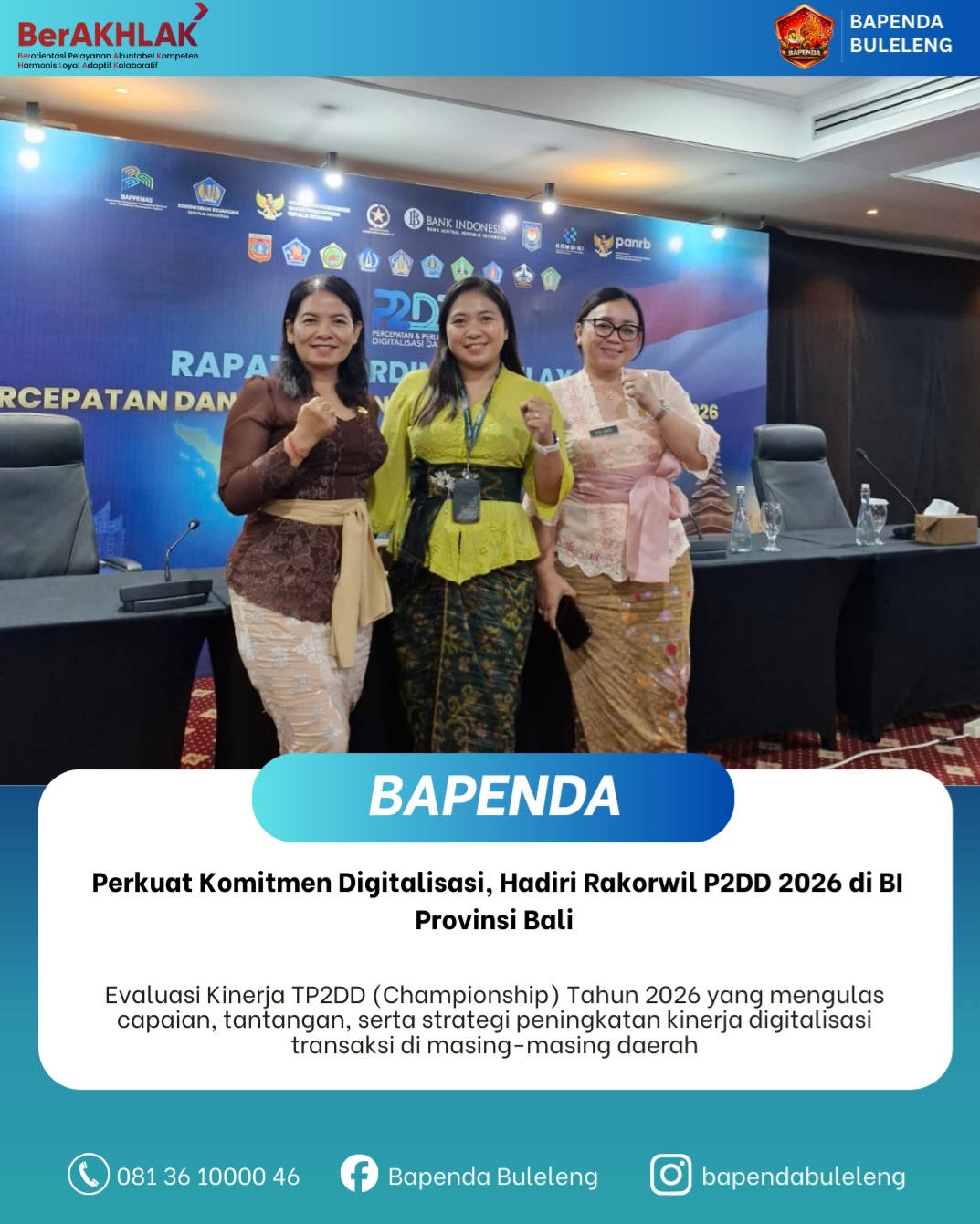 Badan Pendapatan Daerah (Bapenda) Kabupaten Buleleng menghadiri Rapat Koordinasi Wilayah Percepatan dan Perluasan Digitalisasi Daerah (P2DD) Tahun 2026 yang diselenggarakan pada Kamis (12/2) bertempat di Kantor Perwakilan Bank Indonesia Provinsi Bali.